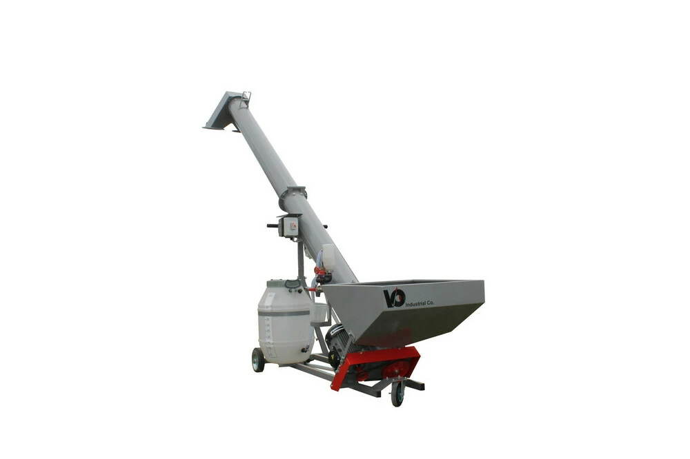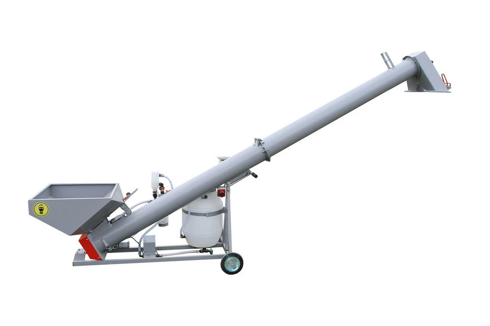 Высота выгрузки регулируется от 80 см. до 2,40 м. Горловина для выгрузки в мешки может монтироватся на короткий шнек для загрузки мешков на земле, а также на длинный шнек для выгрузки в мешки на кузов грузового автомобиля. Без горловины семена выгружаются на бурт или кузов грузового автомобиля. Протравливатель передвижной на колесах.