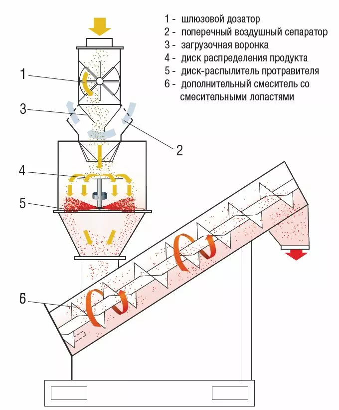 - гомогенное первичное смешивание за счет особенно мелкого распыления протравителя с помощью распылительного диска и эффективное дополнительное перемешивание сырья.
