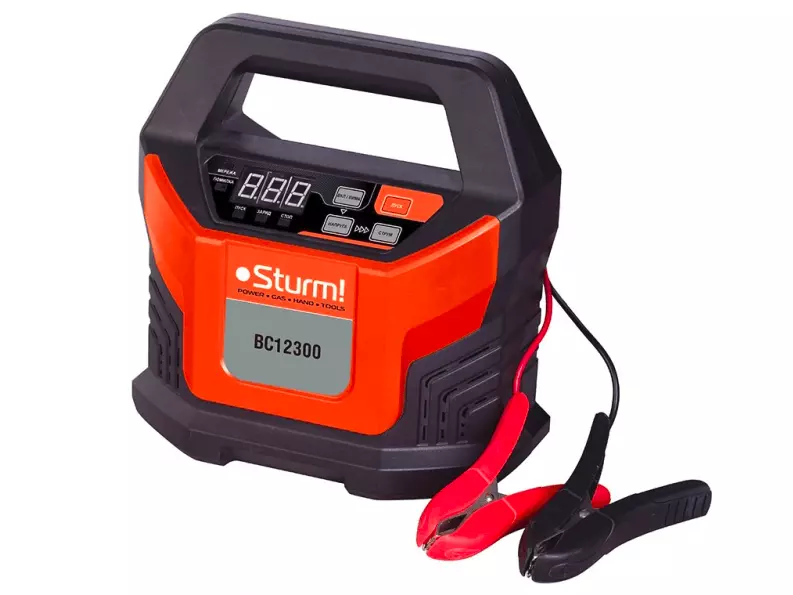 Зарядное устройство инвертного типа  Sturm  BC12300 — заряжает свинцово-кислотные аккумуляторы у легковых автомобилей и мотоциклов. Его напряжение в работе составляет 12 В, а ёмкость — 2 – 400 Ач. Коэффициент полезного действия при max показателях тока достигает 85 процентов.