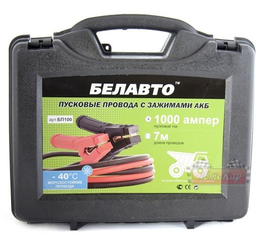 Провода прикуривания Белавто BP100 - полупрофессиональные провода для запуска двигателя автомобиля с разряженным аккумулятором от исправного аккумулятора другой машины. Провода идут в комплекте с пластиковым кейсом. Благодаря длине в 7 метров Вы сможете протянуть одно авто к другому с запасом. За безопасность использования отвечают упругие зажимы клемм, что предотвратят скольжение. Сам провод рассчитан на максимальную нагрузку при старте двигателя 1000 Ампер. Обладает морозостойкостью и способен выдерживать максимально низкие температуры до -40 ° С .