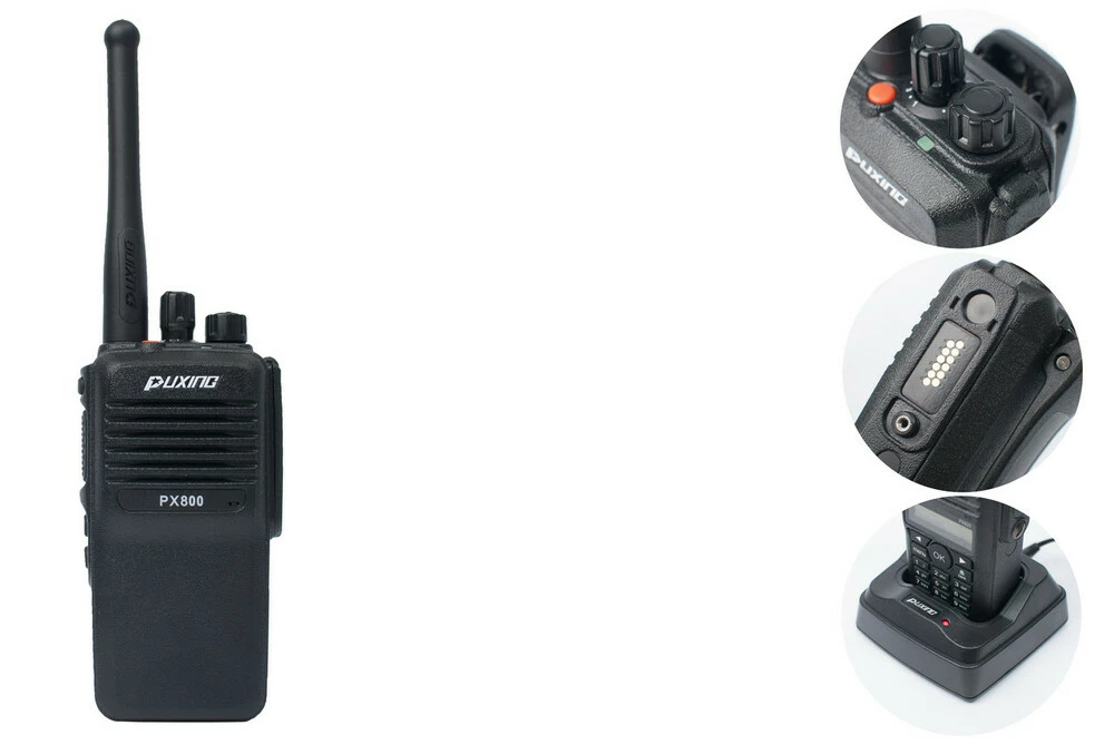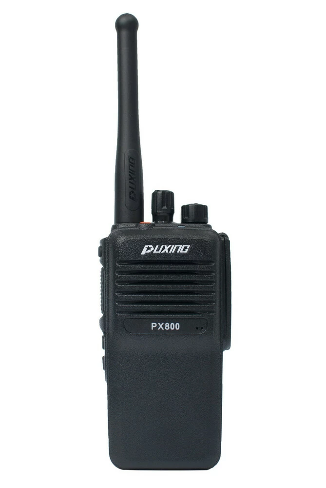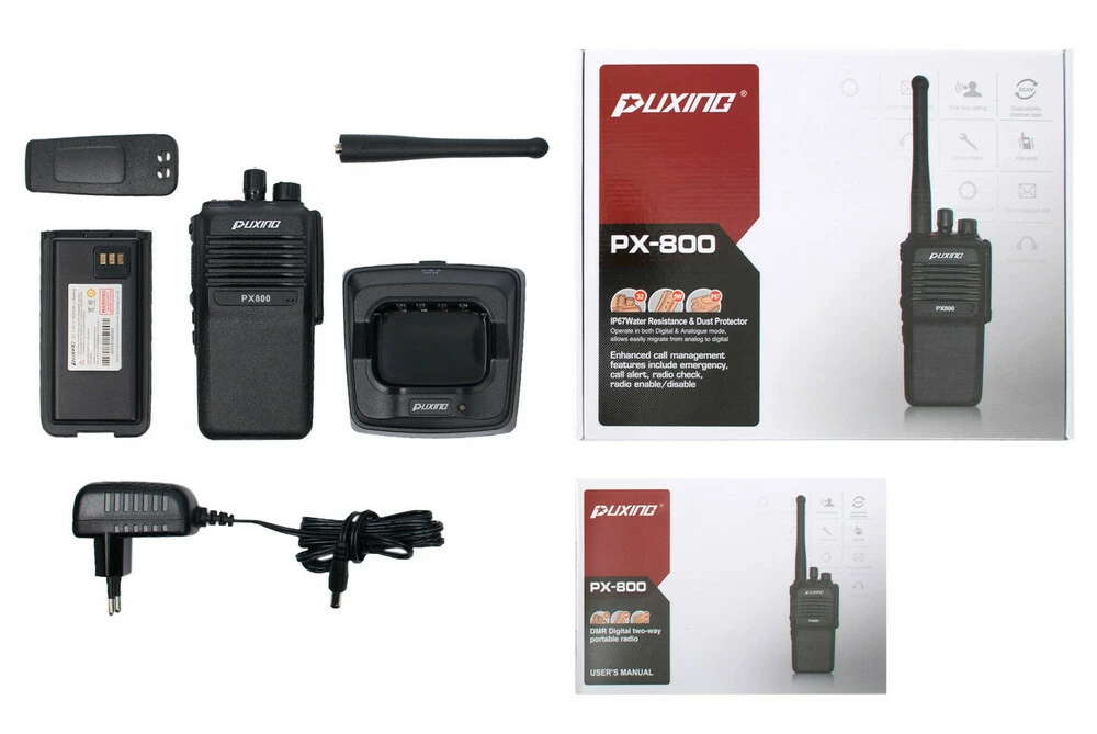 Puxing PX-800 cтандарта DMR. Имеет пылевлагозащиту корпуса согласно уровня IP67, может работать как в цифровом так и в аналоговом режимах.