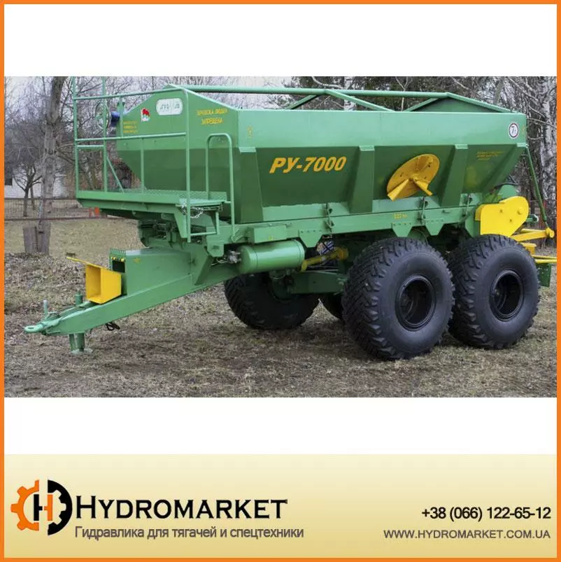 РУ-7000-1 имеет механический привод (от ВОМ-трактора) распределяющих центробежных органов (тарелок) и гидравлический привод подающего транспортера от гидросистемы трактора. Программирование и контроль дозы внесения осуществялется бортовым компьютером.