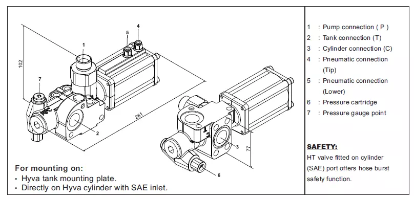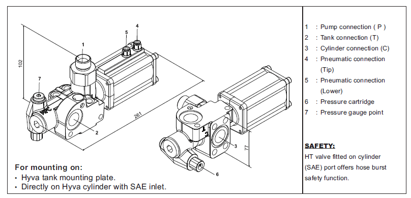 - ограничитель максимального давления и ограничитель максимального пикового давления цилиндра. Типичные клапаны имеют лишь клапан максимального сброса давления, который ограничивает давление в системе. Клапан HYVA PT также защищает цилиндр от внезапных и неуправляемых пиков давления, которые могут возникать во время разгрузки водителем липких материалов путем струшення машины. Такое действие запрещена, однако встречается на практике. Результатом может стать образование пиков давления. Их размер настолько значительным, что может вызвать разрушение цилиндра. Клапан PT эффективно защищает цилиндр от повреждений в таких ситуациях