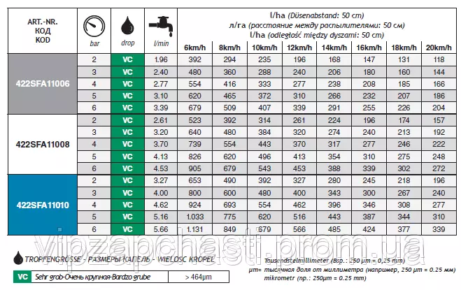 Характеристика распылителя SFA