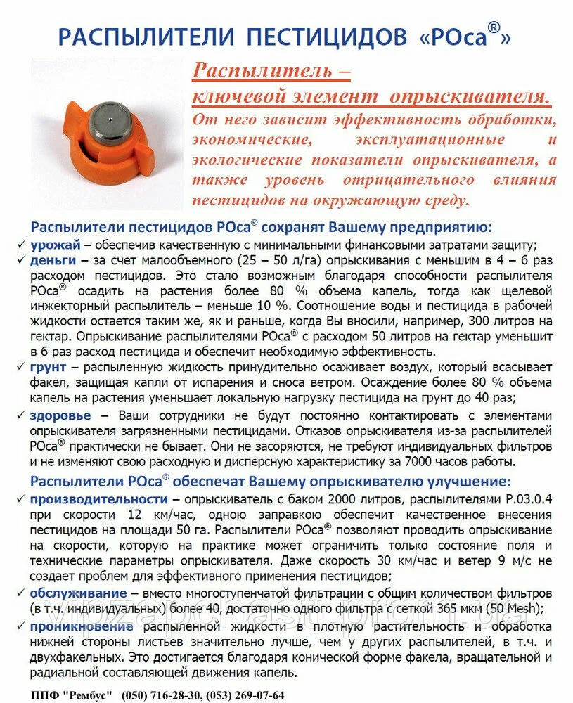 - надежные ― не засоряются и не нуждаются в индивидуальных фильтрах, отказов опрыскивателя из-за распылителей РОСА практически не бывает, корпус и сопло изготовлены из нержавеющей стали;