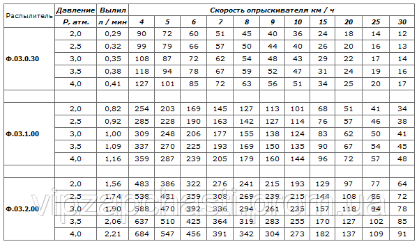 - распылители Р.03.2.0 одной заправкой опрыскивателя с баком 2000 литров при скорости движения 30 км/час позволяют провести опрыскивание на площади 25 га, но могут внести и 300 л/га на скорости 8 км/час;