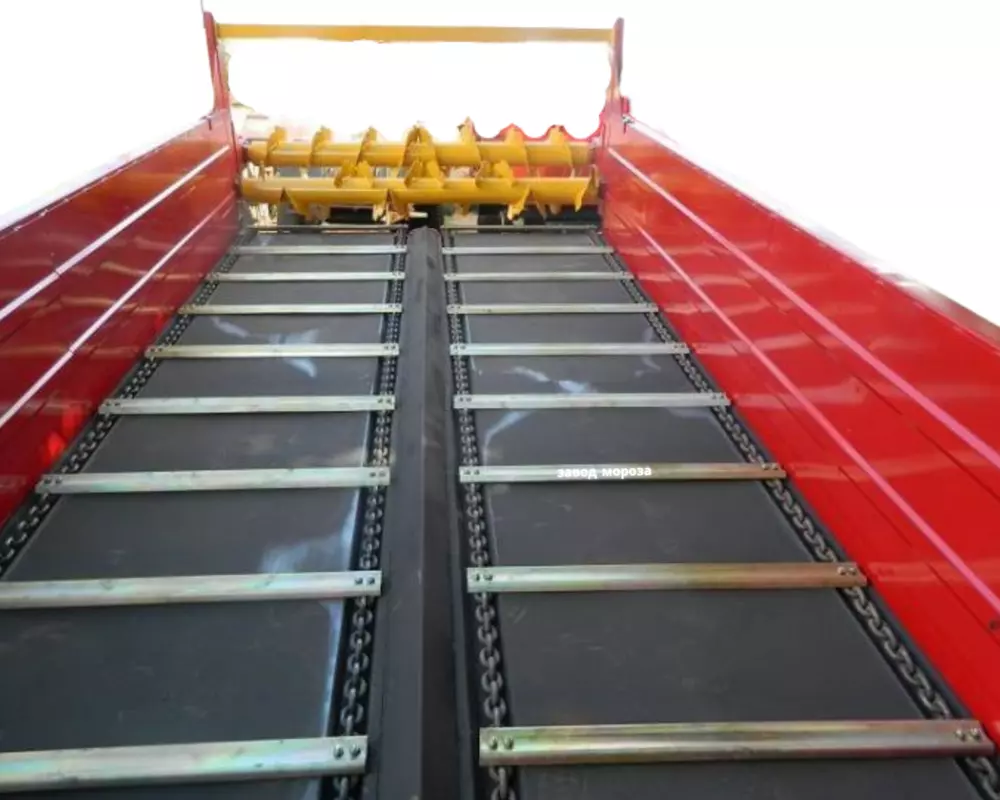 Стрічка транспортера закріплена хомутами, вона представлена у формі ланцюгів, виготовлених із високоміцного металу. Цепи зі шкребками. Натягування механізму відбувається за допомогою натяжних болтів. Вал потужності, приводить транспортер у рух.