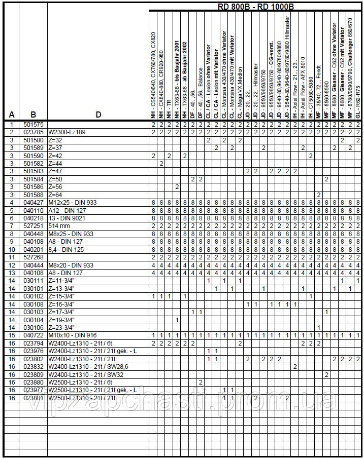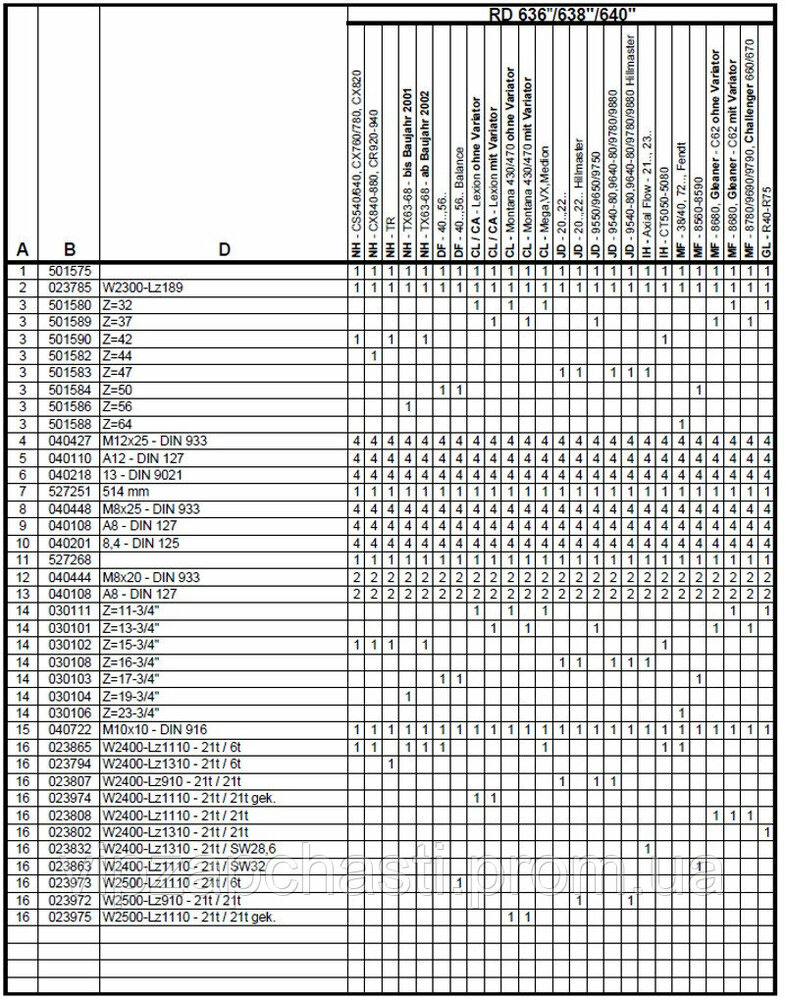 на Claas Lexion, Claas Montana 430/470, Claas Mega VX, MF-8680, Challenger 660/670, GL-R62-R75