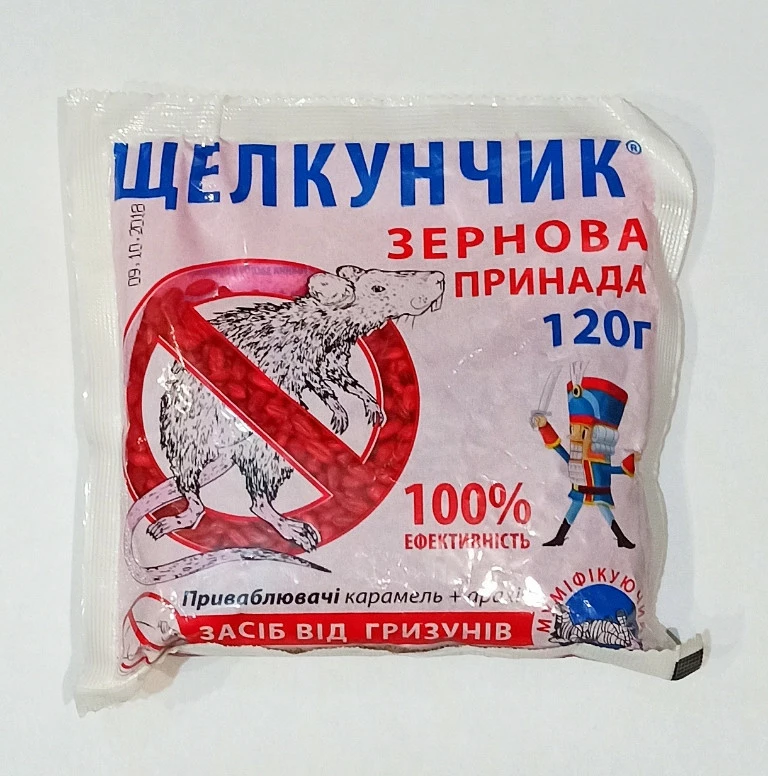 Состав Щелкунчик 120 г. зерновой приманки Съедобным структурным элементом является зерно, в которое порционно добавляется ароматизатор, мумификатор и бродифакум.