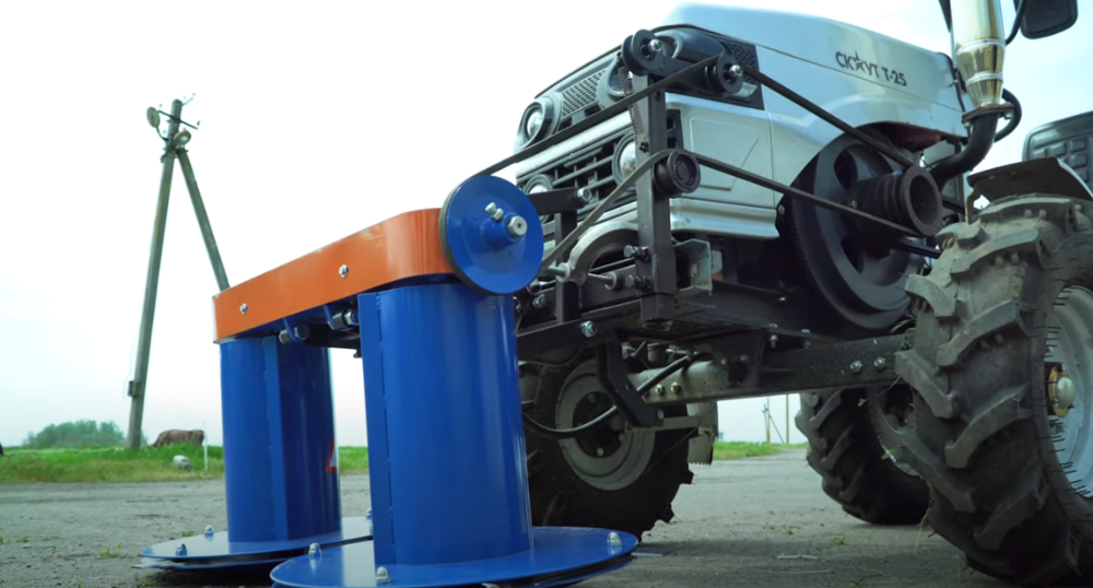 Второй вариант предполагает применение общего приводного ремня. В такую комплектацию ремень входить не будет. В зависимости от параметров трактора необходимо подбирать длину ремня по месту.