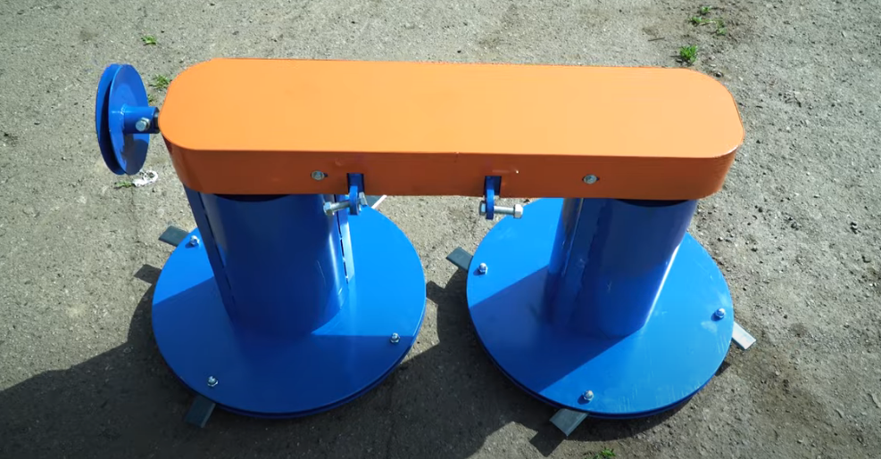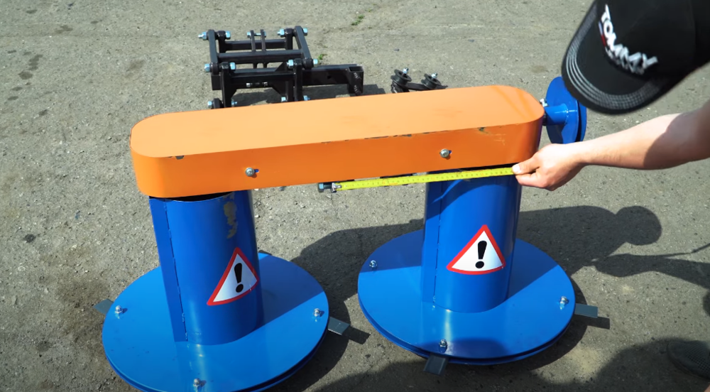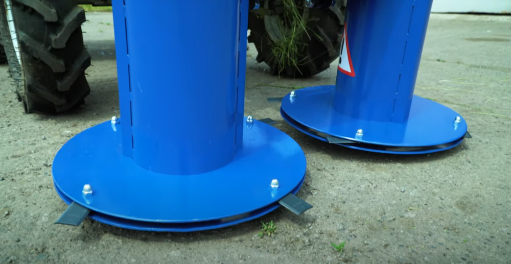 Основами роторов являются две дисковые выпуклые опоры, благодаря которым косилка плывет по поверхности грунта. На краях роторов расположены плоские ножи, на каждом роторе по четыре. В конструкции нижнего опорного диска использованы 2 подшипника – радиальный и опорный.