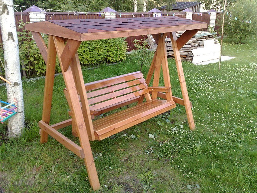 Деревянные качели естественным образом и достаточно удачно вписываются в любой экстерьер, красиво и эстетично сочетаясь с любым сооружениями и садовыми украшениями вокруг.