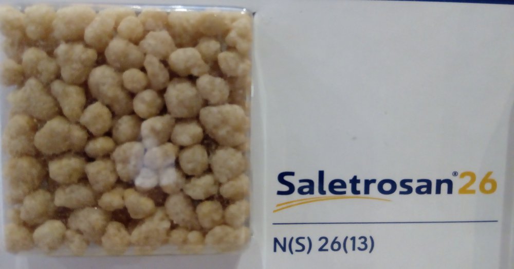 Гранулированный Saletrosan 26 одного из крупнейших в мире производителей азотных удобрений Grupa Azoty содержит 19% азота в аммонийной форме (NH 4 ), 7% азота в нитратной форме (NO 3 ), и 32.5% серы в форме (SO 3), полностью растворимого в воде. Saletrosan 26 представляет собой смесь сульфата аммония и аммиачной селитры в одной грануле с преобладанием доли сульфата аммония.