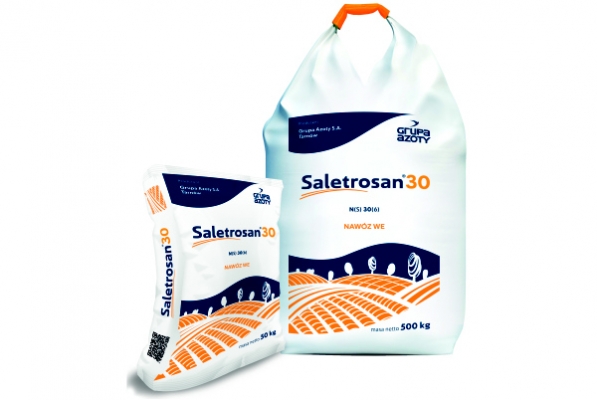 Saletrosan® 30 содержит 30% общего азота (N), включая по крайней мере 18% азота в аммониевой форме (NNH4 +) и по меньшей мере 12% азота в форме нитрата (NNO3-). Содержание серы (S) составляет 6%, что в пересчете на триоксид серы дает 15% SO3. Сульфатная сера, присутствующая в Saletrosan®, полностью растворима в воде и поэтому полностью доступна растениям.