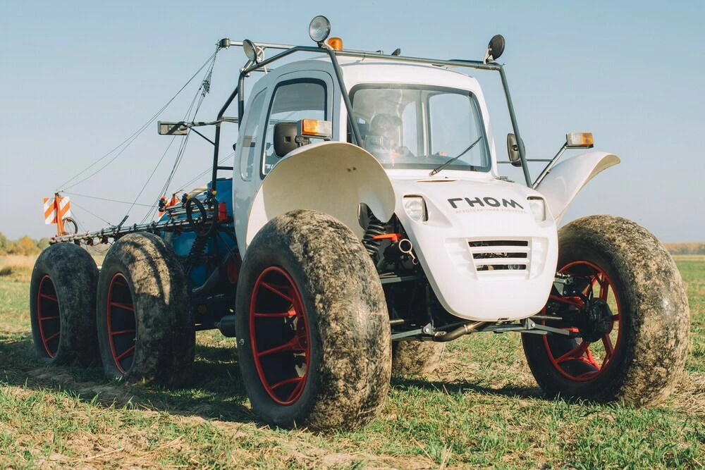 Агротехнічний комплекс Обприскувач самохідний «ГНОМ»  ідеально працює на перезволожених грунтах, в тому числі  по мерзло-талому грунту, та на полях зі складним рельєфом та забезпечує грунтозберігаючі технології землеробства.