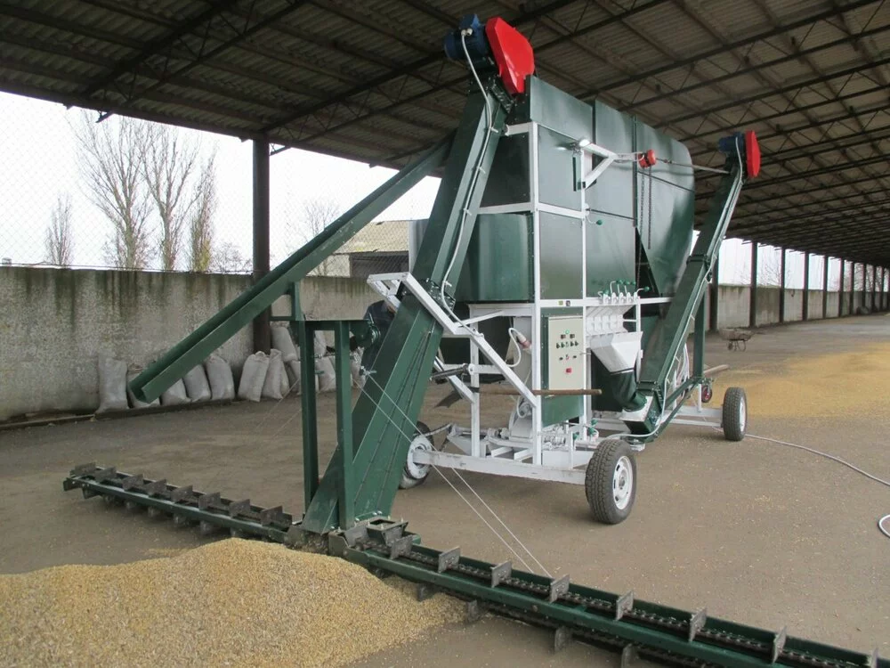 Зерно с помощью загрузочного транспортера подается в бункер-накопитель, в котором расположены три датчика, два из которых связаны с колесами. При заполнении бункера датчики включают или выключают ход движения, во избежание пересыпания в автоматическом режиме. Далее зерно с бункера поступает в камеру сепарации, в которую подается ламинарный поток воздуха, создаваемый двигателем с импеллером, где оно разделяется по фракциям в лотки. Оператор выбирает нужный лоток и с помощью рычагов направляет их на отгрузочный транспортер. Для сбора пылевых отходов предусмотрена циклонно-осадочная камера, которая снабжена также второй осадочной камерой, под которой находится бункер отходов на колесах. Возврат чистого воздуха осуществляется через боковой воздуховод. Регулировка комплекса осуществляется с помощью пульта управления.