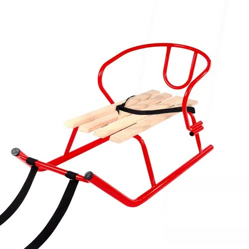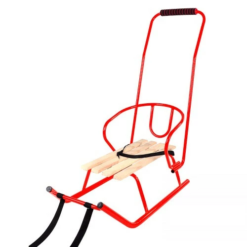 Цвет санок - красный, каркас металлический, сиденье выполнено из прочных пород дерева.