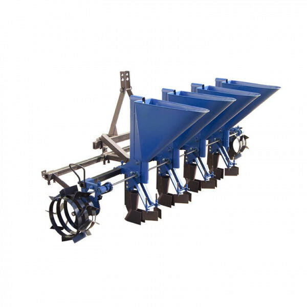 Чеснокасажалка 4х рядная (ложки стандарт 24,5) (ЧС8). Агрегатируется с минитракторами. Конструкция прицепного узла рассчитана под крепление в трех точках и использование системы гидравлического подъема. Почва требует подготовки. Для посадки необходимо использовать откалиброванные зубки чеснока размером 15-25 мм. Емкость бункера для посадочного материала составляет 10 литров, количество бункеров – 4 шт. Привод механизма дозировки от опорно-приводных колес.