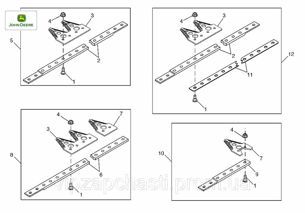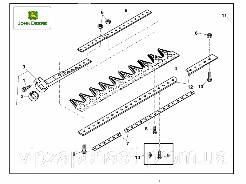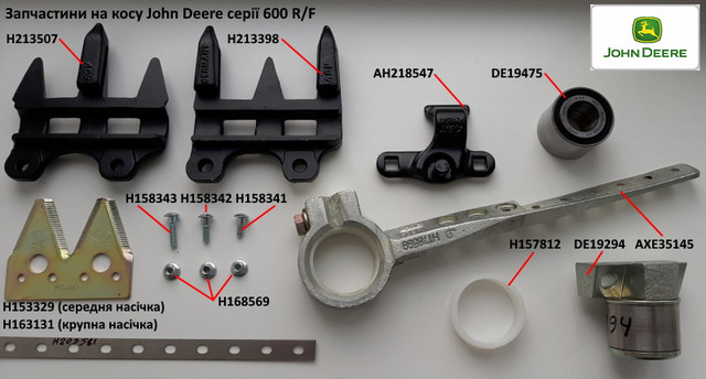 на жатки John Deere 600 серии (головка косы - AXE35145 / прижим ножа - AH218548 / палец тройной - H213508, H213405 / болт - H158341 / гайка - 14M7303)
