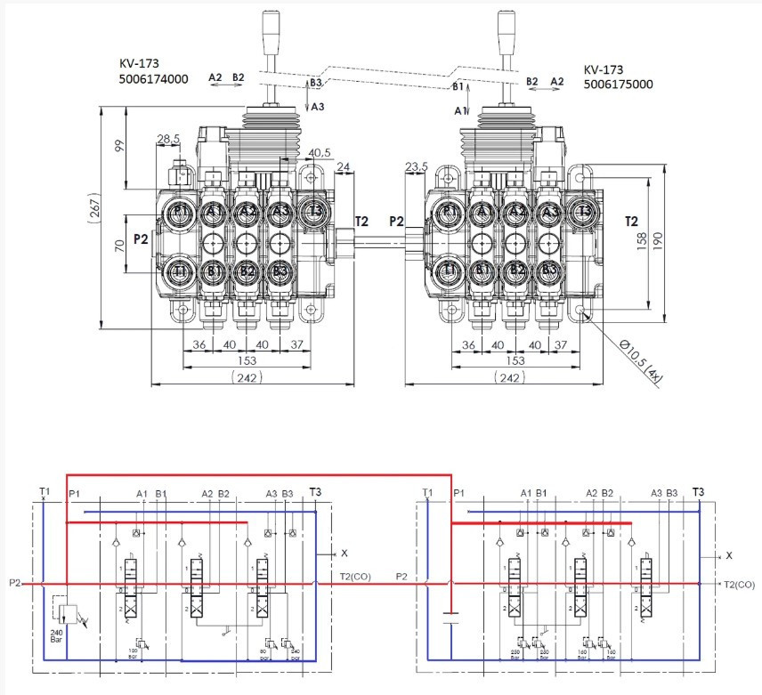 Специально спроектировано трехсекционный распределитель пропускной способностью 80 л / мин оснащен клапанами обратного нагрузки, главным и antichoc & anti cavitation предохранительными клапанами для защиты основных операций крана от динамических и грузовых перегрузок. Идеально подходит для установки на гидроманипуляторы с верхним постом управления такие как Loglift, Hiab, HMF, Jonsered, Atlas, Fassi, Palfinger, SG, Велмаш, ОМТ 120, ОМТЛ, DL 100, Атлант, Синегорец и др. В сравнению с аналогами PC и SN распределитель KV-173 имеет существенные преимущества в конструктивной части распределителя позволяют выполнять одновременную подачу масла на оба распределителя при последовательном подключении, тем самым обеспечивая максимальное быстродействие и совмещение операций. Аналогичные схемы подключения доступны в брендах RM 313, RM-RS 270 Nordhudraulic, SDM-SDS Walvoil, HСD Hydrocontrol.