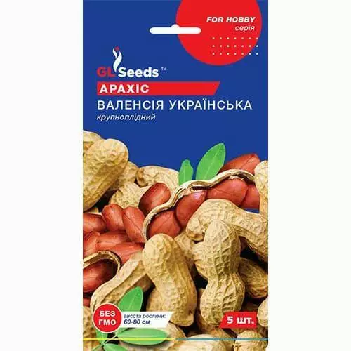 Арахис Валенсия украинская характеризуется крупными плодами. В высоту растение может достигать 60-80 см. Имеет гладкие и овальные ядра, плотно расположенные в бобах, диаметр которых составляет 12-15 мм. Семена находятся в толстой оболочке бобов по 2-4 штуки. После того как образовалась завязь, плодоножка цветов становится длиннее и проникает в почву, где и образовываются «земляные орехи».