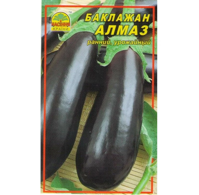 Баклажан «Алмаз» — проверенный временем среднеспелый сорт со стабильно высокой урожайностью. Растение компактное, хорошо приспособлено для выращивания в открытом грунте и теплицах. Плоды удлинённо-цилиндрической формы, ровные, с глянцевой тёмно-фиолетовой кожицей.