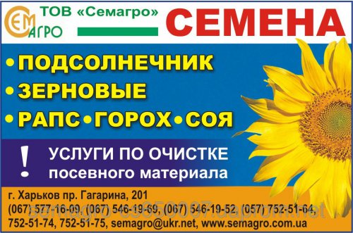 Общество с ограниченной ответственностью «Семагро» работает на рынке семян с 2001 г. ООО «Семагро», находясь в постоянном взаимодействии с Институтом растениеводства им. В.Я. Юрьева УААН, занимается внедрением самых современных достижений науки в области семеноводства и технологии выращивания подсолнечника, кукурузы и сои.
