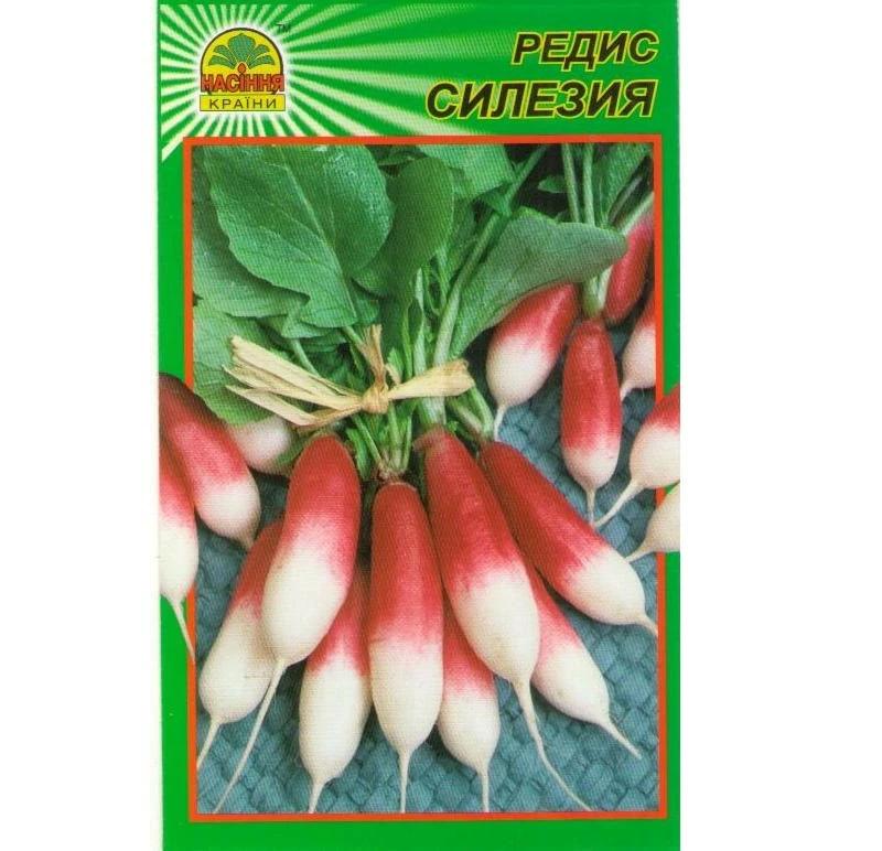 Редис силезия. Сорт раннеспелый. От всходов до созревания 21-25 дней. Корнеплоды продолговатые, легко вытягиваются, розово-красного цвета, с белым кончиком. Мякоть нежная, сочная, плотная, без горечи. Стойкий к стрелкованию. Вкусовые качества высокие. Схема посадки 9×3 см