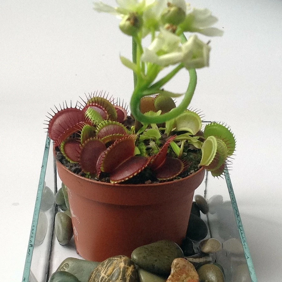 Когда у дионеи появятся 3-5 настоящих листьев, её пересаживают в индивидуальные горшки. Пересадочную процедуру выполняют с большой аккуратностью, помня о том, что у венериной мухоловки хрупкие корни. Дионея растёт очень медленно и взрослым растением она станет только через 5 лет.
