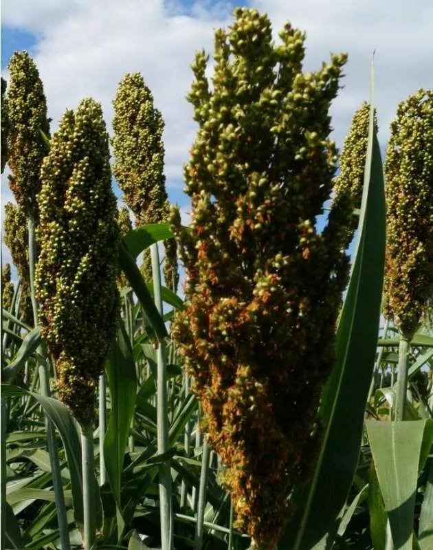 Перспективный высокоурожайный гибрид обычного сорго зернового и силосного направлений, в котором удачно сочетаются полноценная кисть с большими зерновами без танина, высокорослость (1,8-2,0 м), хорошая облиственность и устойчивость к полеганию.