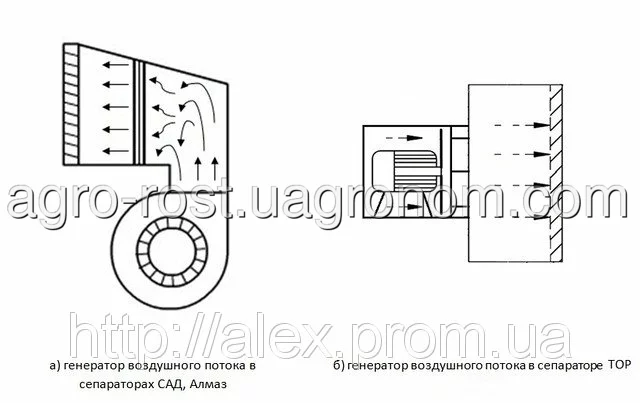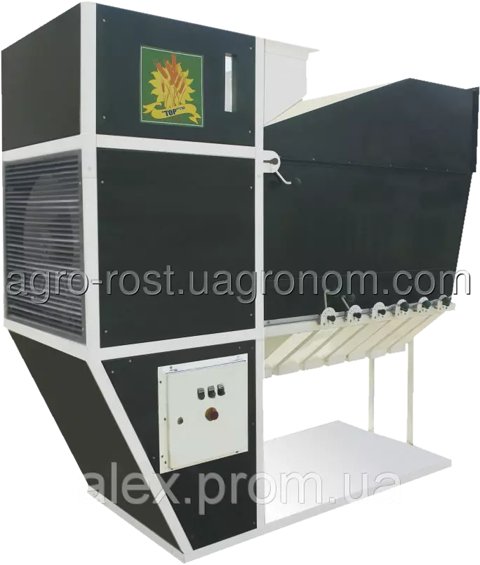 Сепаратор делит исходное зерно потоком воздуха путем прохождения зерна через камеру сепарации по двум критериям: вес и парусность. То есть, из грязного зерна на входе мы получаем на выходе 7 фракций: тяжелые примеси – 1 фракция, посевной материал – отборное, крупное биологически ценное зерно (2 и 3 фракции) и товарное зерно (4 и 5 фракции). Фуражное зерно (половинки, четвертинки, битое, неполноценное зерно) - последние 2 фракции. Легкий мусор, пыль и не зерновые отходы выдуваются через воздуховод. Все лотки на веялке установлены на сквозные направляющие, что позволяет направлять любой поток зерна в любую от машины сторону и перекрывать лотки. С помощью поворотных шторок можно перенаправить поток зерна в соседние лотки. Это дает максимально точные настройки веялки зерна для получения максимального результата при чистке, калибровке и отборе посевного или товарного материала, а так же при разделении зерно смесей.