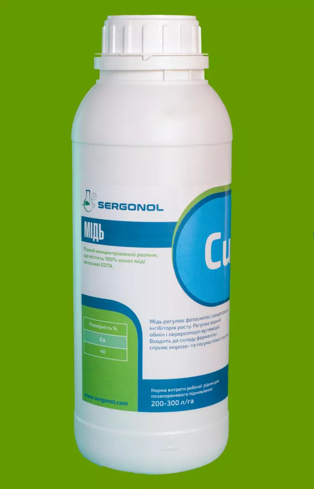 Препарат эффективно компенсирует дефицит меди в растениях. Не содержит балластных добавок, поэтому не вызывает ожогов листьев, полностью усваивается через листовую поверхность растений.               Медь входит в состав ферментов и участвует в окислительно-восстановительных процессах, около 50% меди содержится в хлоропластах. При дефиците меди нарушается лигнификация клеточных стенок, снижается интенсивность дыхания и фотосинтеза. Признаки медного голодания проявляются чаще на торфянистых и кислых песчаных почвах. Симптомы заболевания для зерновых культур проявляются в побелении и засыхании кончиков листовой пластинки.               При сильном дефиците меди растения начинают усиленно куститься, но в дальнейшем колошения не происходит, и весь стебель постепенно засыхает. Плодовые культуры при недостатке меди болеют, так называемой, «Сухой верхушкой» или экземой. Наиболее чувствительными растениями к недостатку меди являются: пшеница, ячмень, овес, лен, кукуруза, морковь, свекла, лук, шпинат, люцерна, белокочанная капуста, картофель.