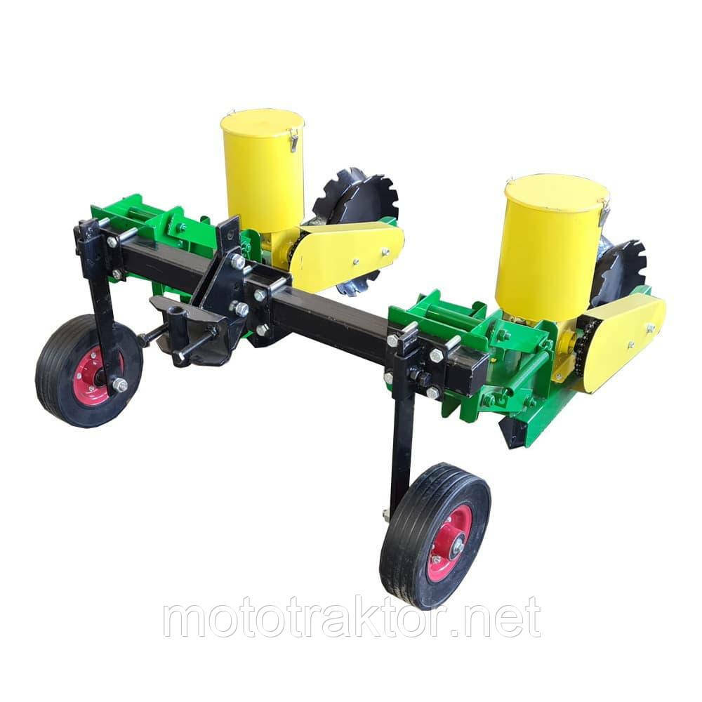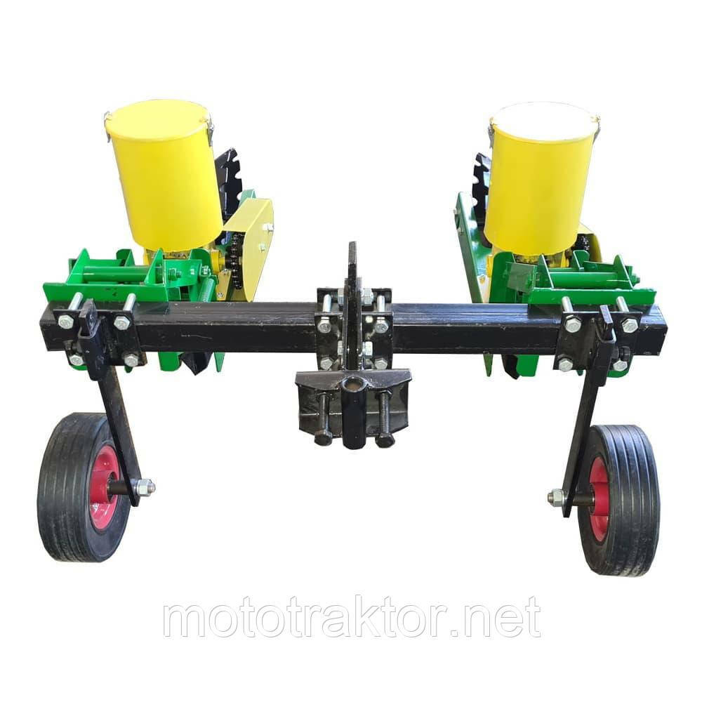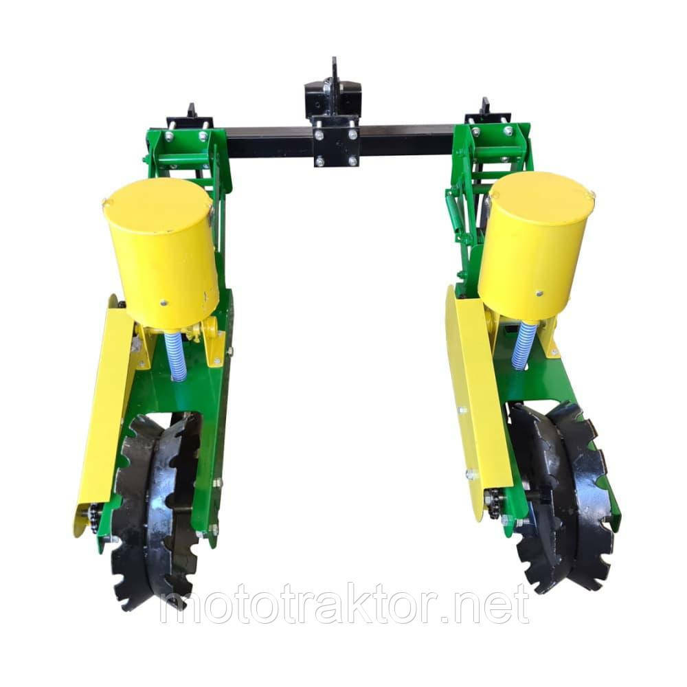 Сеялка для мотоблока и мототрактора СМ-2 двухрядная навесного типа работает от опорно-приводных колес и предназначена для посева овощных и зерновых культур: свеклы, кукурузы в два ряда с глубиной высева до 7 сантиметров.