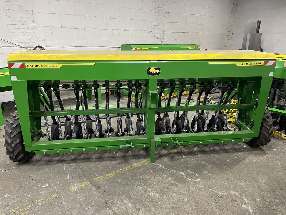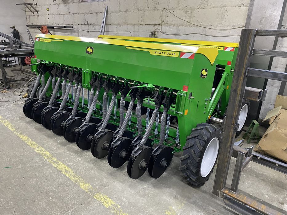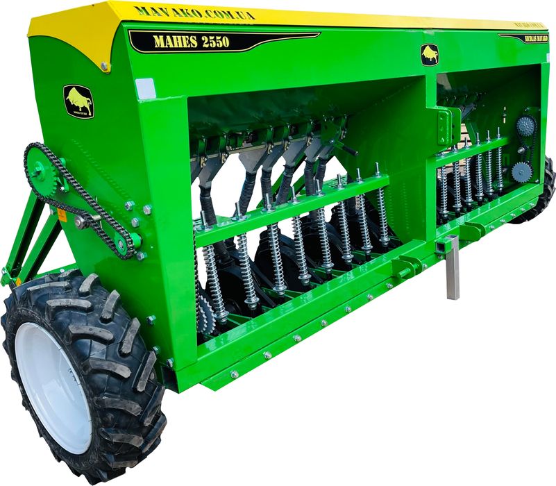 Навісна сівалка Mahes 2550 призначена для висівання зернових за допомогою міні трактора. Засипане в бункер насіння самопливом заповнює прийомні камери висівних апаратів. Котушки приводяться в дію за допомогою привідного колеса. Під час руху сівалки з опущеними в робочому положенні сошниками, котушки зернових апаратів, обертаючись, захоплюють насіння і викидають їх у воронки насіннєпроводів. Із насіннєпроводів насіння, скочуючись по стінках сошників, потрапляє в підготовлену ним борозенку. Насіння загортається за допомогою пружинної борони, встановленої позаду сошників сівалки. Від якості загортання насіння в грунт значною мірою залежить схожість і розвиток рослин. Саме тому на наші сівалки ми встановлюємо якісні висівні механізми.