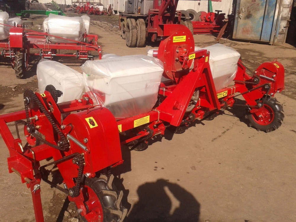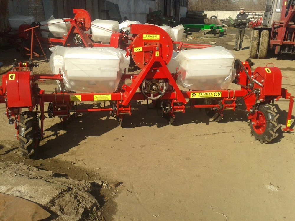 Сеялки СУ-4 предназначены для пунктирного посева калиброванных и некалиброванных отсортированных семян кукурузы, подсолнечника и прочих культур с одновременным внесением минеральных удобрений и прикатыванием почвы в рядках.  В сеялке СУ-4 создание разрежения обеспечивается вентилятором ВР-1, установленным на сеялку, приводимого от ВОМ  трактора.Несущий брус рамы сеялки является ресивером ее пневмосистемы. Сеялка комплектуется пластиковыми зерновыми и туковыми бункерами. СУ-4 предназначена для работ во всех почвенно-климатических зонах, кроме зоны горного земледелия.