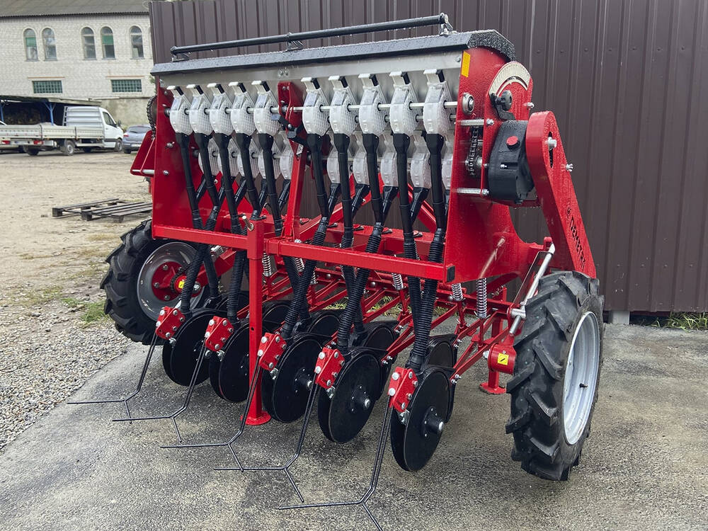 Сеялка зернотуковая "ДЕМЕТРА МИНИ" 1500V, c бесступенчатой коробкой передач(вариатор), предназначена для рядового посева зерновых культур (пшеницы, ячменя, ржи, овса), зернобобовых (соя, горох, фасоль, нут, чечевица, бобы), мелкосемянных культур (рапс, горчица, лен) сыпучих и средне сыпучих семян трав с одновременным внесением минеральных удобрений.