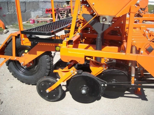 - единая конструкция узла («сошник и прикатывающий каток») позволяет настраивать сошник на определенную глубину заделки семян с интервалом в 1 см. Сохранение параметра глубины заделки семян влияет на равномерную всхожесть, увеличение урожайности.