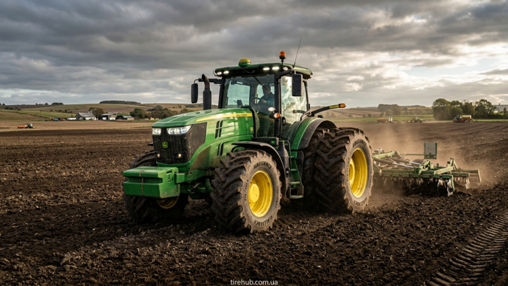 John Deere 9R — колесный трактор с четырьмя большими сельскохозяйственными шинами. Он хорошо подходит для транспортных работ и обработки больших полей.