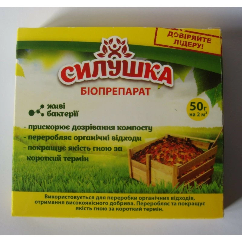 Биопрепарат "Силушка" для компостирования. Ускоряет процесс переработки органических отходов на биогумус (удобрение), удаляет неприятные запахи. Норма расхода - 50 г на 1250 кг отходов.
