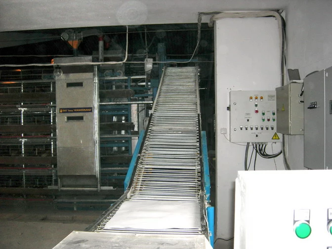 Этажерчатая система сбора яиц устанавливается на оборудовании ОКБП на каждой батарее и обеспечивает максимальную сохранность яйца родительских форм. Выходя из продольных ленточных транспортеров яйцо попадает на наклонные ленточные с перемычками транспортеры с каждой линии и перемещается на стол где укладывается на прокладки.