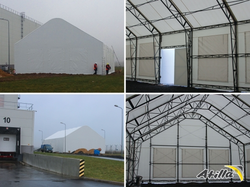 Каркасно-тентовая конструкция склада: металлический фермовый каркас, тентовое покрытие из промышленной ткани ПВХ 950 гр/кв.м. (Panama).