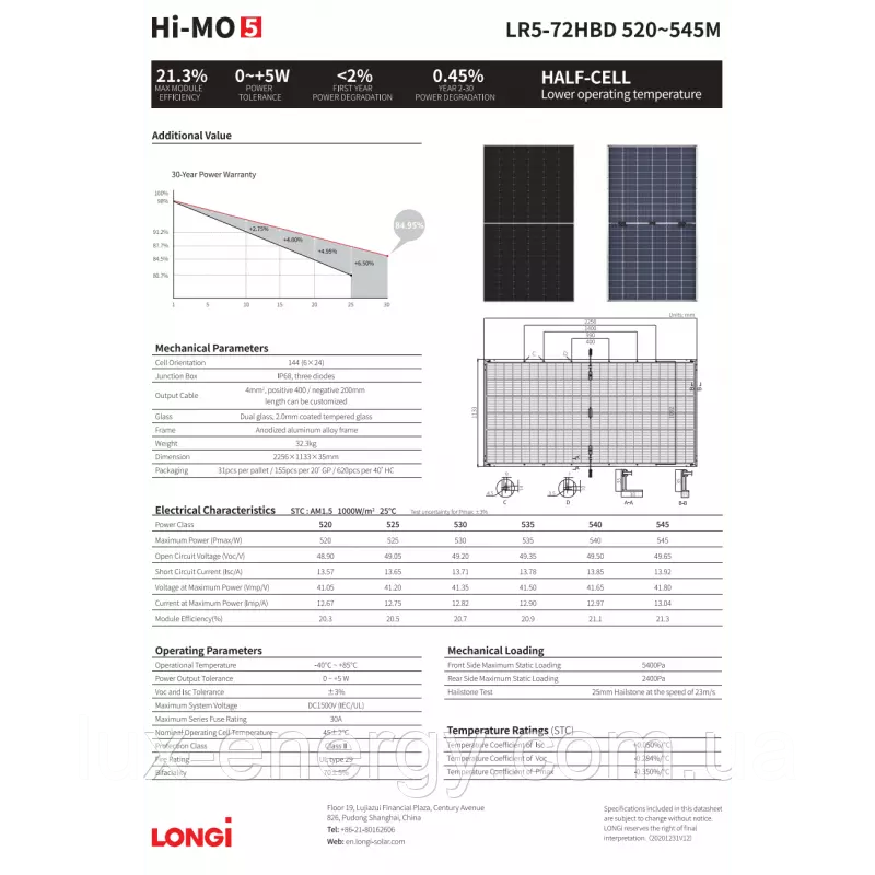 •  ККД панелей LONGi Solar LR5-72 HBD 540 Bifacial досягає більше 21% (за рахунок новітніх технологій та якісних компонентів і збірки).