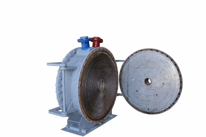 Спиральный теплообменник состоит из двух спиральных каналов, навитых из рулонного материала вокруг центральной распределительной перегородки - керна. По торцам каналы завариваются с обеих сторон. Для придания жесткости и фиксации ширины расстояния между спиралями на одной из сторон спирали приварены штифты. По торцам теплообменник закрыт плоскими крышками с прокладками, в центральной части которых установлены штуцера. Два других штуцера находятся в верхней части корпуса на коллекторах.