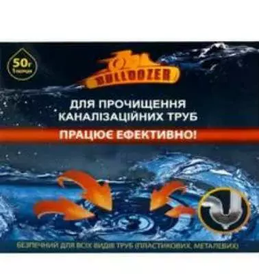 Бульдозер — эффективное средство для прочистки канализационных труб любых видов (пластиковых, металлических), стоков, сифонов. Предназначено для устранения неприятных запахов и  удаления застоявшихся бытовых отходов — растительный и животный жир, рыбья чешуя, волосы, известковый налет и пр. Состав — гидроксид натрия, гидроксид калия, хлорид натрия, активатор. Не содержит красителей и ароматизаторов.