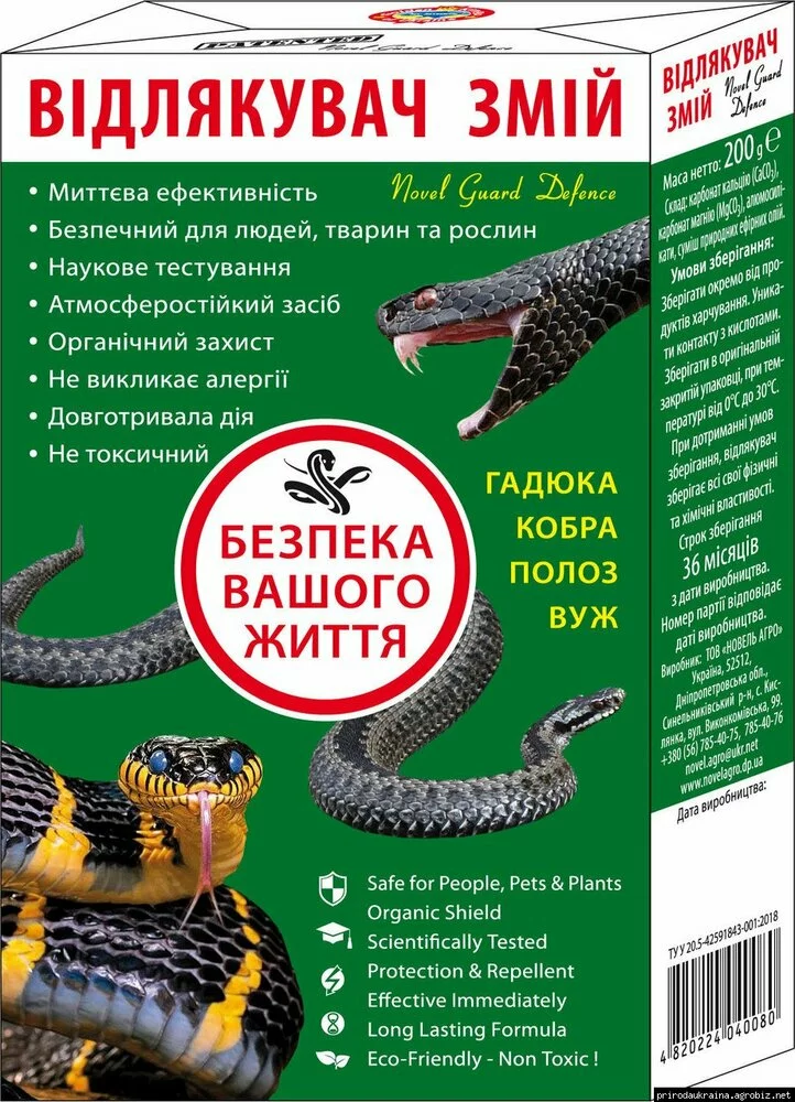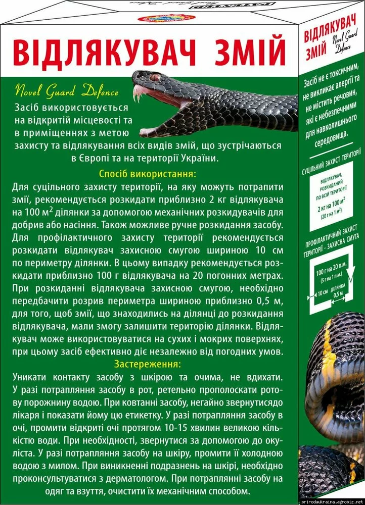 Новое безопасное для людей органическое средство-отпугиватель . Используется на открытой местности для защиты и отпугивания участков от змей, которые встречаются на территории Украины и Европы(гадюка,полоз,кобра,уж). Применяется на сухих и мокрых поверхностях. Эффективно работает независимо от погодных условий.