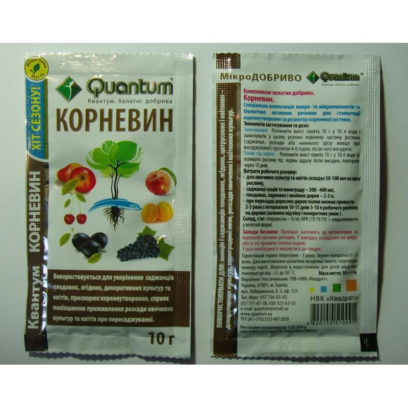Комплексное хелатное удобрение. Используется для укоренения саженцев плодовых, ягодных, декоративных культур и цветов, ускоряет корнеобразование, способствует улучшению приживаемсоти рассады при пересаживании. Норма расхода: 10 г на 10 л воды.