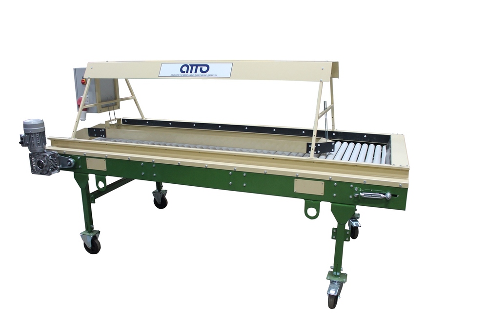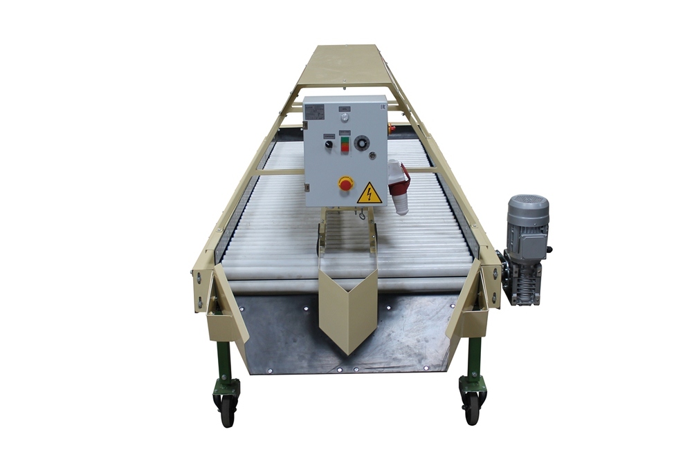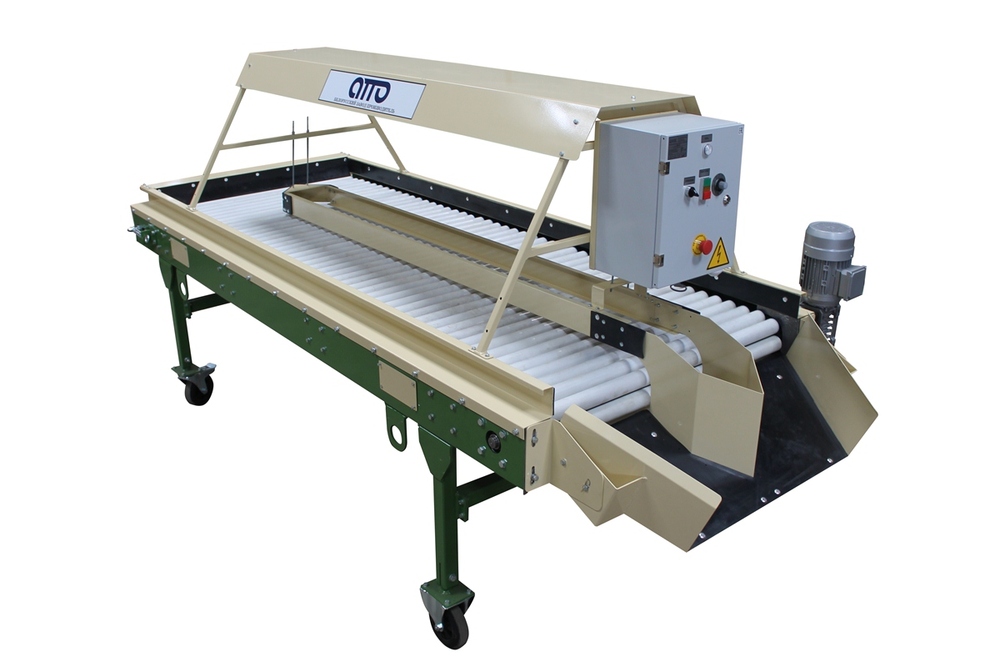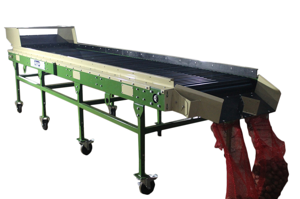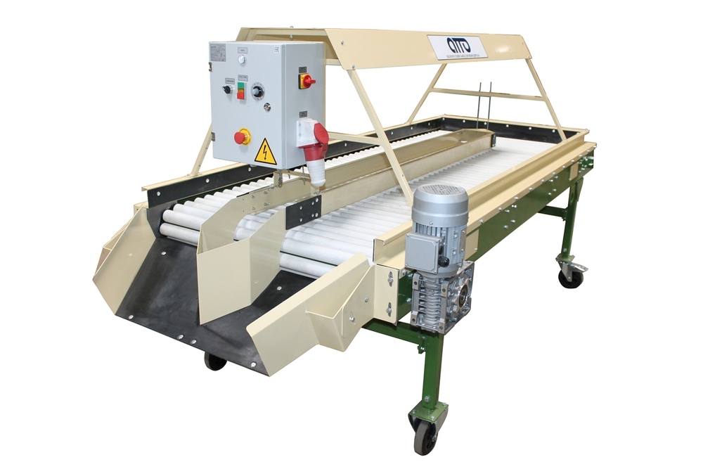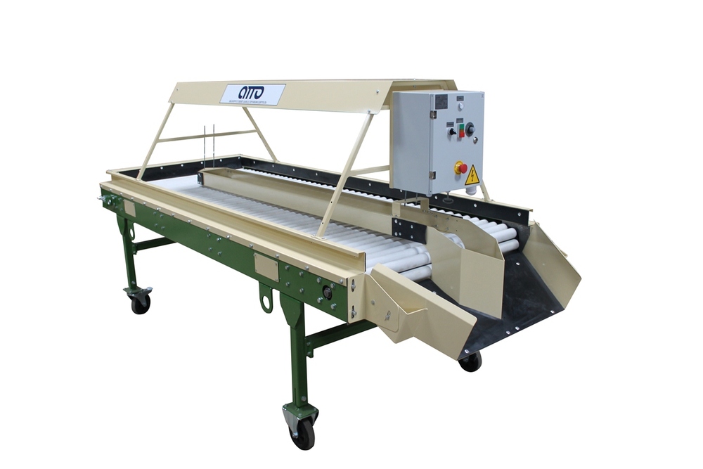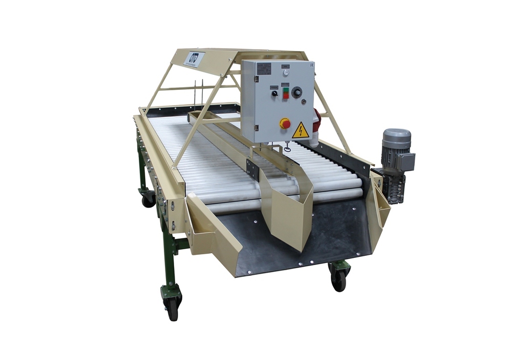 стол роликовый инспекционный (сортировочный переборочный стол) для переборки овощей и картофеля КРИ-10 - предназначен для ручной инспекции овощей, картофеля, лука, моркови, свеклы, фруктов. Некачественные (подгнившие, нестандартные, битые и т д.) овощи помещаются в разделитель, находящийся в центральной части конвейера, откуда автоматически попадают на отводящий наклонный транспортёр или в специальную тару (контейнер). Качественные овощи перемещаются далее по линии по переработки овощей или отводятся для упаковки в сетки, мешки, пакеты (сетка-держатель на 4 сетки). В зону сортировки овощи подаются автоматически с помощью вращающихся роликов. Сортировочный переборочный стол установлен на колёсных опорах (мобильный). Имеется плавная регулировка конвейера по высоте. На Сортировочном столе установлен частотный преобразователь для регулировки скорости движения роликов. Имеется освещение по желанию заказчика (входит в стоимость стола).  Сортировочный стол изготавливается в двух вариантах: 1. С сетка-держателями на 4 сетки, 2. С выгрузным лотком.