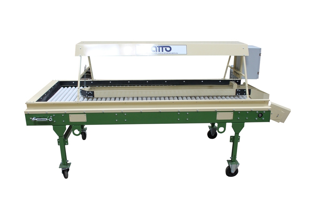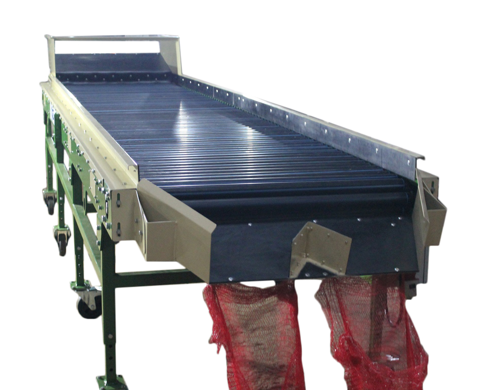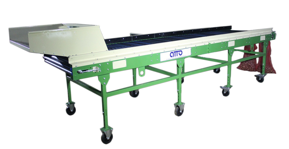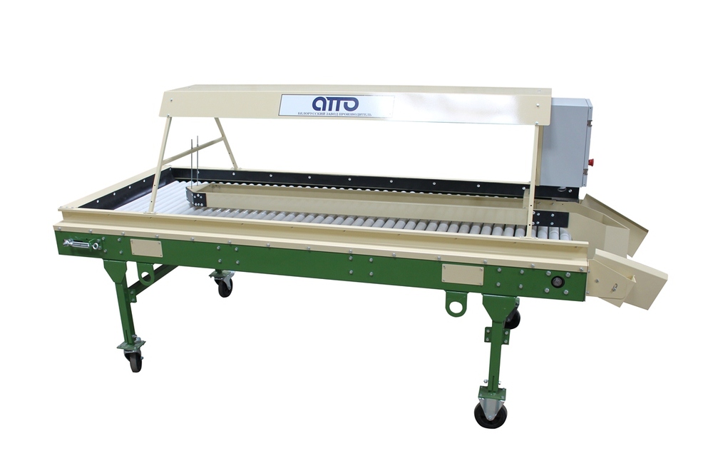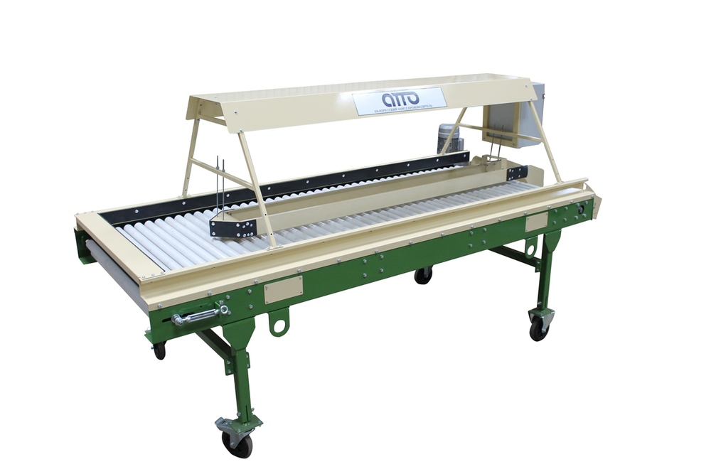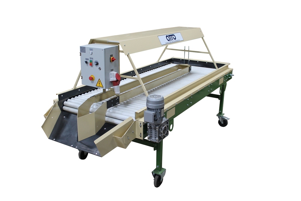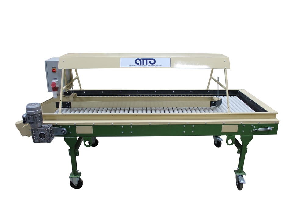 стол роликовый инспекционный (сортировочный переборочный стол) для переборки овощей и картофеля КРИ-10 - предназначен для ручной инспекции овощей, картофеля, лука, моркови, свеклы, фруктов. Некачественные (подгнившие, нестандартные, битые и т д.) овощи помещаются в разделитель, находящийся в центральной части конвейера, откуда автоматически попадают на отводящий наклонный транспортёр или в специальную тару (контейнер). Качественные овощи перемещаются далее по линии по переработки овощей или отводятся для упаковки в сетки, мешки, пакеты (сетка-держатель на 4 сетки). В зону сортировки овощи подаются автоматически с помощью вращающихся роликов. Сортировочный переборочный стол установлен на колёсных опорах (мобильный). Имеется плавная регулировка конвейера по высоте. На Сортировочном столе установлен частотный преобразователь для регулировки скорости движения роликов. Имеется освещение по желанию заказчика (входит в стоимость стола).  Сортировочный стол изготавливается в двух вариантах: 1. С сетка-держателями на 4 сетки, 2. С выгрузным лотком.