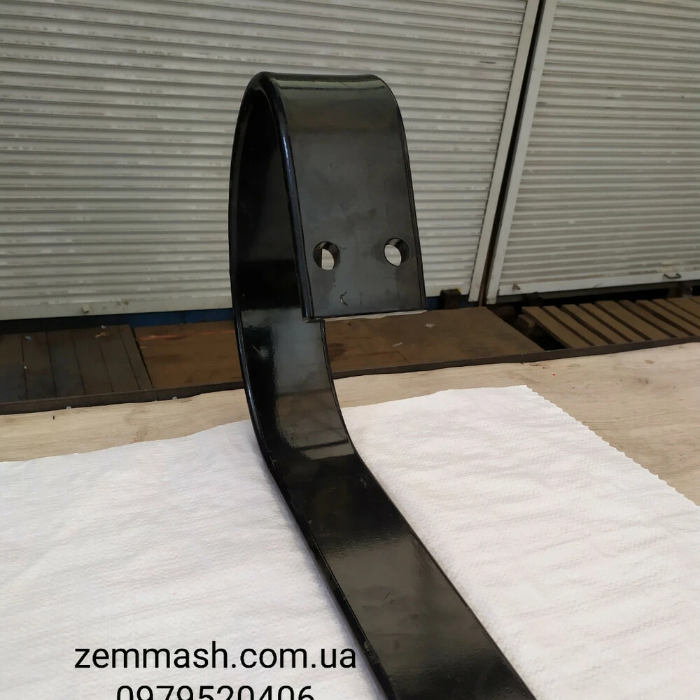 Стойка пружинная 8395.ДЛМ-4.05.200 для дисковой бороны купить в ХарьковеПружинная стойка пришла на замену традиционной стойке в дисковых агрегатах. Ранее все дисковые бороны имели жесткую стойку, которая соответствовала требованиям того времени. Стойка выполняет функции опоры и служит для крепления ступицы диска с рамной конструкцией. Но в настоящее время требования к качеству обработки, равномерности и прочности конструкции вынуждают инженеров оставить исчерпанный ресурс жесткой стойки и находить все новые конструктивные решения. Таким решением стала S- образная стойка. Стойка выполнена из рессорного полотна специальной марки стали, изгиб проводится по уникальной технологии на индукторе с равномерным нагревом в месте изгиба. Пружинная стойка обладает следующими преимуществами: 1. Снижение тягового сопротивления при движении на 20% это уменьшает расход топлива, снижая затраты на обработку. 2. Предохраняет рабочий орган, подшипниковый узел и конструкцию рамы от механического повреждения при столкновении с твердыми предметами в почве. 3. Поперечная вибрация, которую создает стойка, предотвращает налипания грунта и пожнивных остатков на диск. 4. Каждая стойка работает практически индивидуально, нивелирую не ровности, и качественно проводит копирование рельефа, не допуская пропусков или углублений. 5. При движении благодаря пружинной стойке рабочий орган получает дополнительно поступательное движение. В итоге работа происходит не только за счет качения диска, но и поступательных движений. Этот эффект можно сравнить с работой «волнистого» ножа для хлеба, даже самый мягкий батон он режет ровно и четко.Экономичность, надежность и эффективность пружинной стойки давно доказана на практике и постепенно вытесняет морально устаревшие и затратные аналоги жесткой опоры.