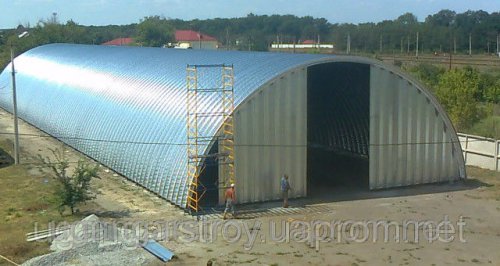 Ангары бескаркасные, арочные, быстровозводимые - 1000кв.м. за 10 дней! В любой точке Украины - мобильный комплекс. Металл - оцинкованная сталь 0,7-1,25мм. С плотностью цинка - 130-280гр./м.кв. Диаметр конструкции - 12-25м. Прочностью - 480кг/м.кв. Область применения - всевозможные объекты промышленного и коммерческого назначения: зерносклады; гаражи; ангары; склады; спорткомплексы; мастерские; корты; крытые манежи, крытые рынки, ..... Стоимостью от 390грн/м.кв.